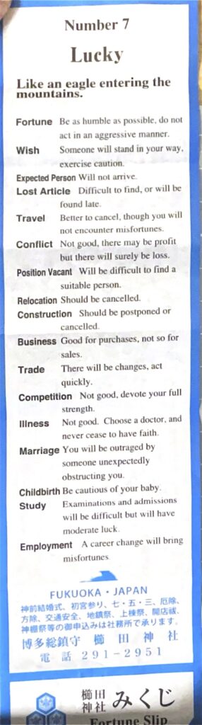 Vor dem Schrein konnte man für 100 ¥ Wahrsagungslose ziehen, die sogenannten Omikuji (おみくじ). Diese sind allerdings spannender als die Texte der Glückskekse vom China-Lieferdienst, denn je nach Schrein oder Tempel gibt es meist fünf bis sieben Abstufungen zwischen „Großes Glück“ und „Großes Pech“. Selbst ein „Glückslos“ wie meines enthält jedoch zahlreiche Warnungen. Die Wahrsagungen und Ratschläge bzw. Warnungen werden von vielen Japanern durchaus ernst genommen, wobei der Glaube nicht unbedingt eine primäre Rolle spielt, sondern viel mehr die rituelle Komponente ausschlaggebend ist.