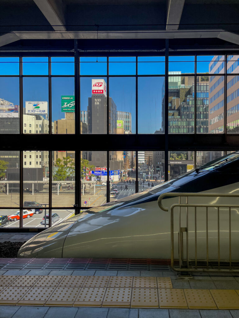 Mit der Fahrt nach Kumamoto stand dann auch endlich meine langersehnte Fahrt mit dem Shinkansen an. Da es nur eine kurze Fahrt war, habe ich mir für die Hinfahrt für einen vergleichsweise geringen Aufpreis ein Ticket für den grünen Wagen (1. Klasse) gegönnt und tatsächlich ist der Komfort bisher der Beste, den ich in einem Zug vorgefunden habe. Die Sitze sind sehr bequem und die Beinfreiheit ist absurd großzügig. Von der Geschwindigkeit her wird, soweit ich die Anzeige gesehen habe, mindestens dauerhaft 250 km/h gefahren. So schafft der Shinkansen die Strecke Fukuoka – Tōkyō in gerade einmal 5 Stunden; Das sind über 1.000 km Strecke!