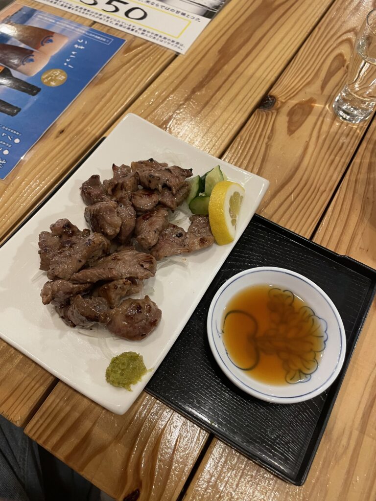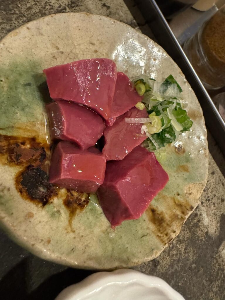 Des Weiteren ist Kumamoto auch für seine zahlreichen Pferdefleischgerichte bekannt und ich habe mich überwunden und gegrilltes Pferdefleisch (馬焼き Ba-yaki) bestellt. Kann ich tatsächlich nur empfehlen.